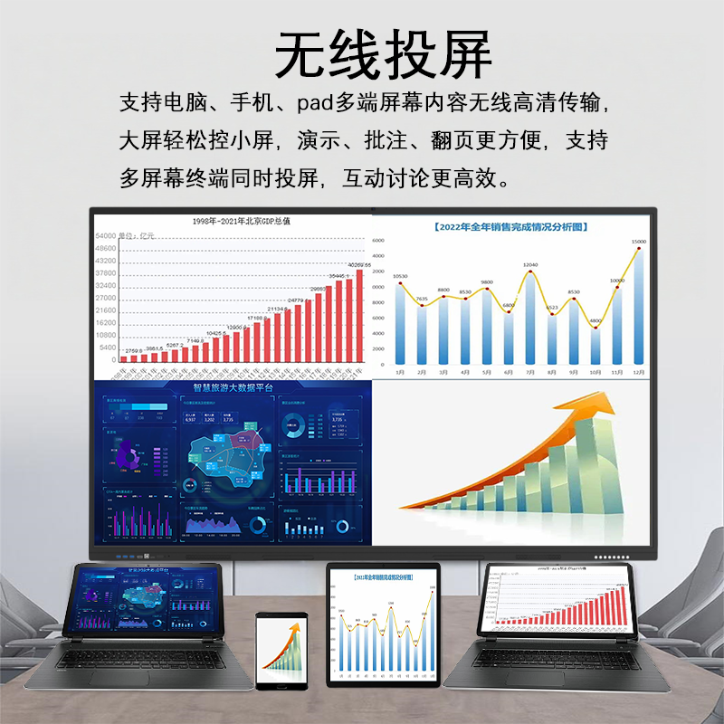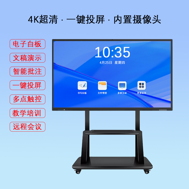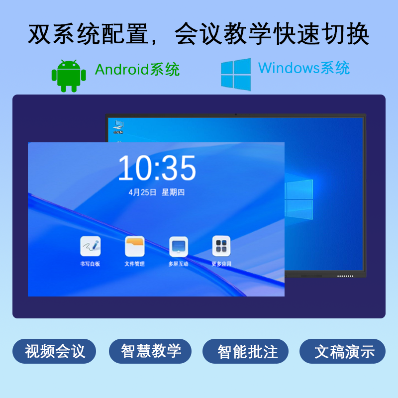 智能会议平板一体机尺寸:55寸、65寸、75寸、86寸、98寸、100寸、110寸、115寸,安卓+Windows系统,双系统,功能齐全,款式多样,支持定制。